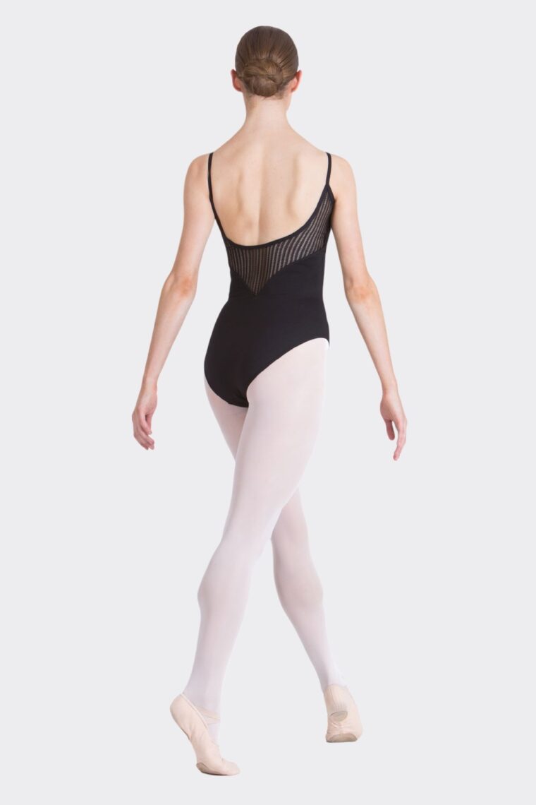 The Macey Leotard features a camisole strap design with a v-shape mesh scooped back. The perfect dance fashion leotard.